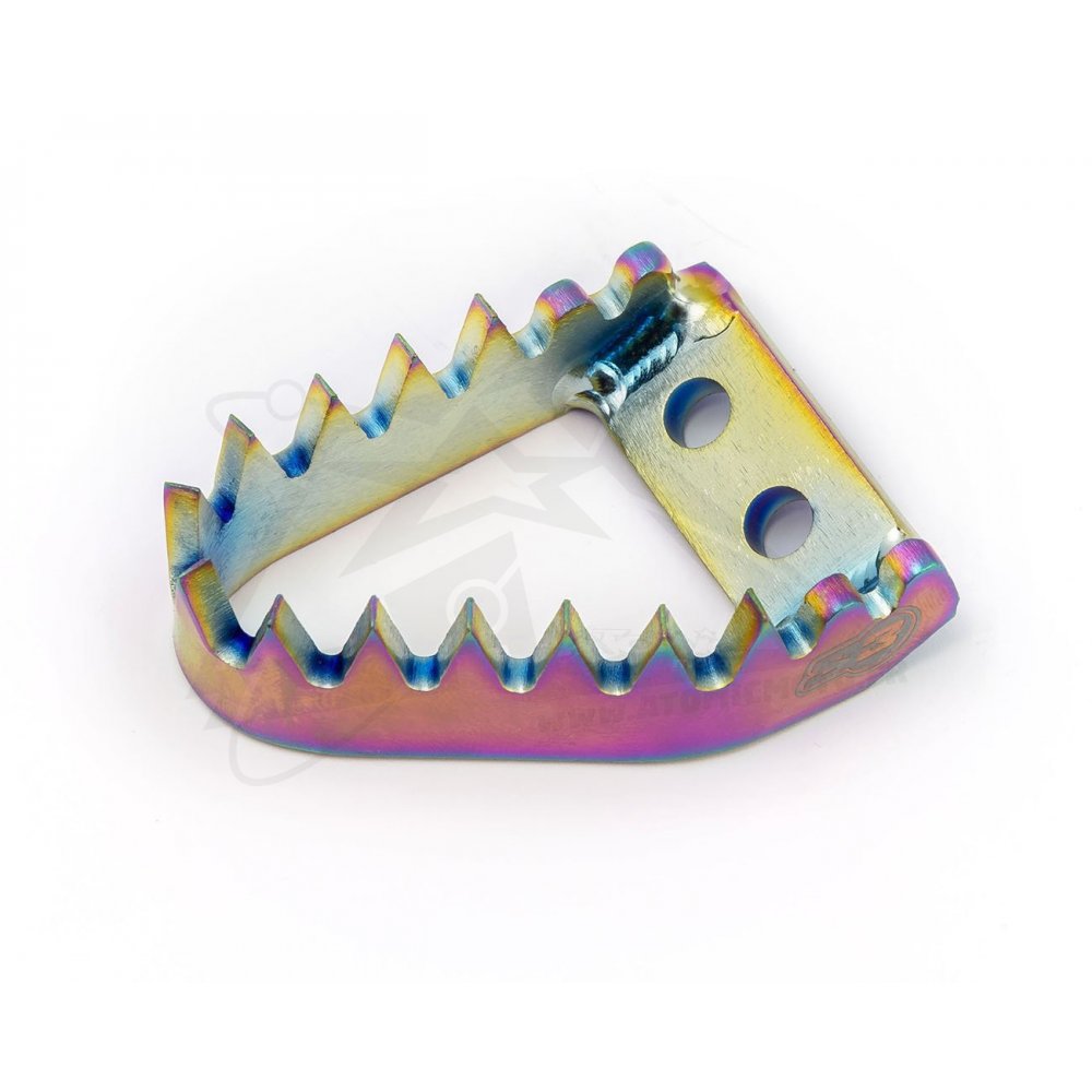 L’embout de pédale de frein S3 est fabriqué en titane Grade 5, l’un des matériaux les plus résistants utilisés en compétition. Sa finition flash titane Rainbow lui donne un look unique tandis que son design PUNK® assure une adhérence exceptionnelle pour un contrôle optimal du frein arrière.