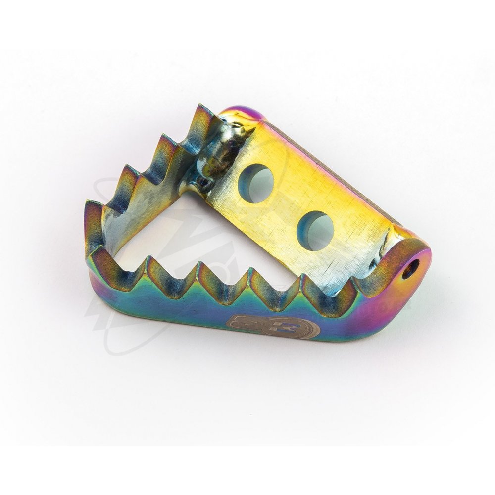 L’embout de pédale de frein S3 est fabriqué en titane Grade 5, l’un des matériaux les plus résistants utilisés en compétition. Sa finition flash titane Rainbow lui donne un look unique tandis que son design PUNK® assure une adhérence exceptionnelle pour un contrôle optimal du frein arrière.